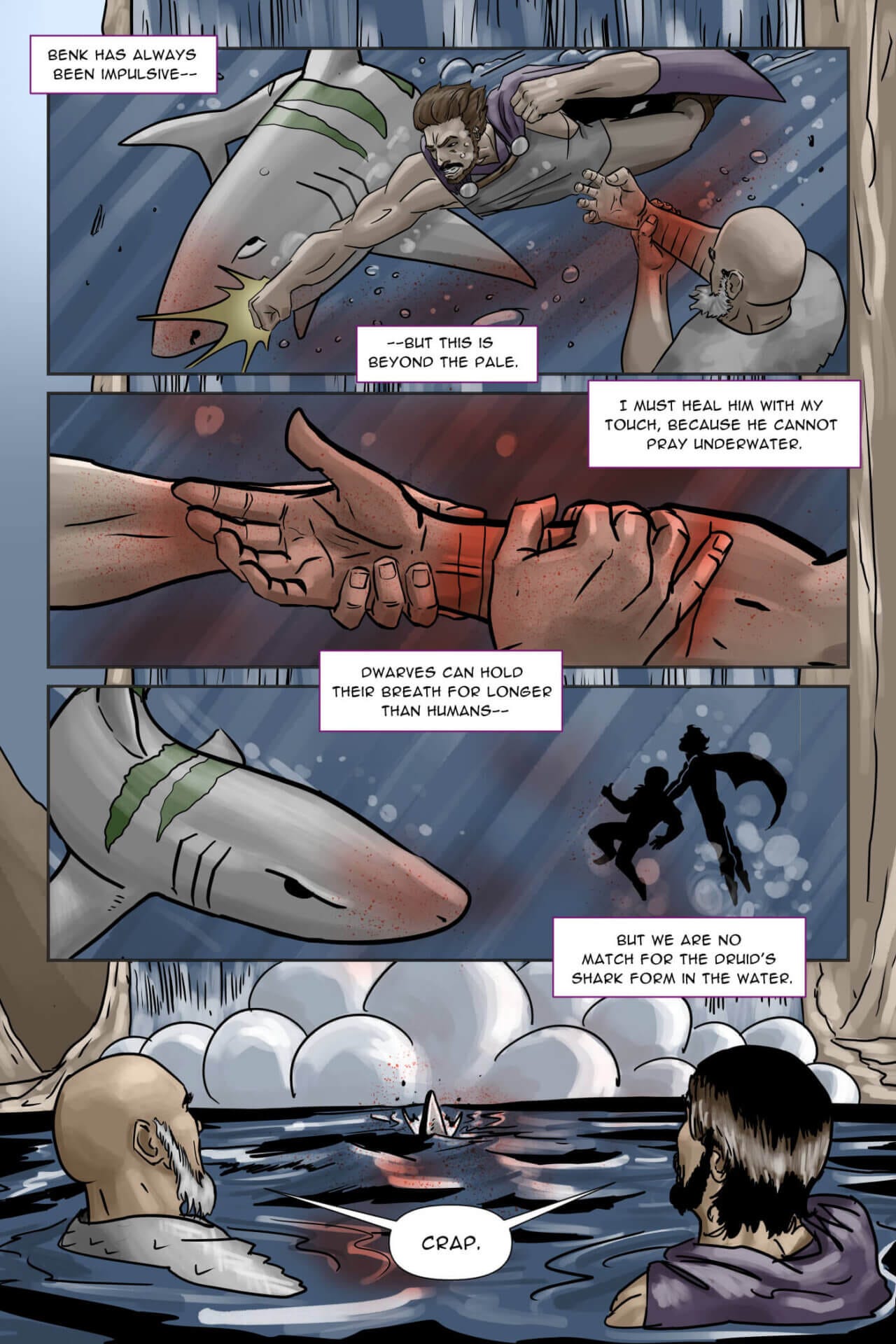 Zindello: (Dwarves can hold their breath for longer than humans, but we are no match for the druid’s shark form in the water.)